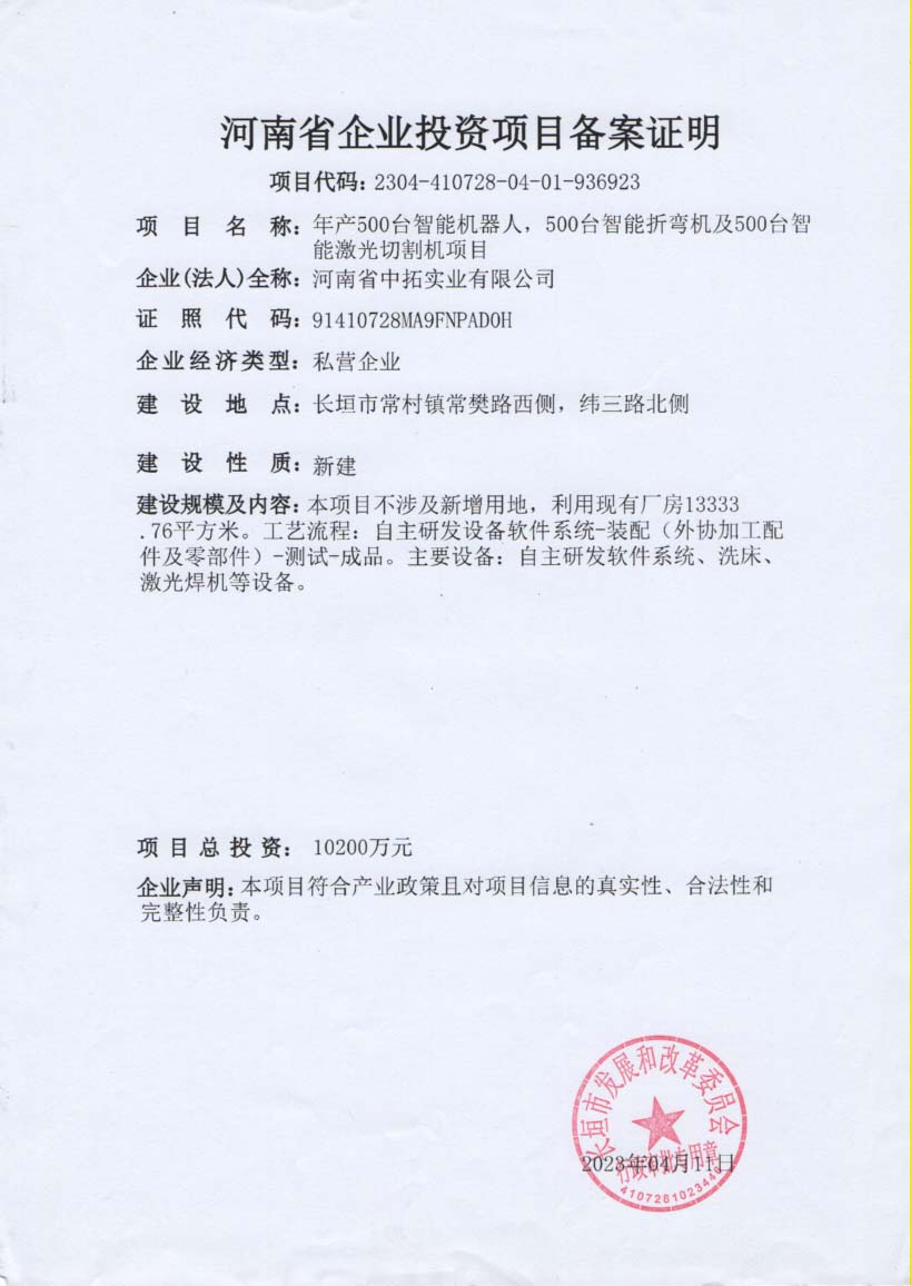 • 大圣智能折彎機,機械臂,激光切割機工廠備案證明
